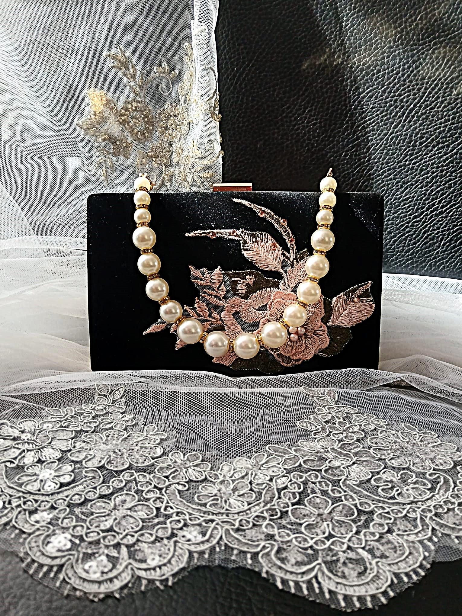 Elegant Evening Clutch with Pearl and Leaf Appliqué