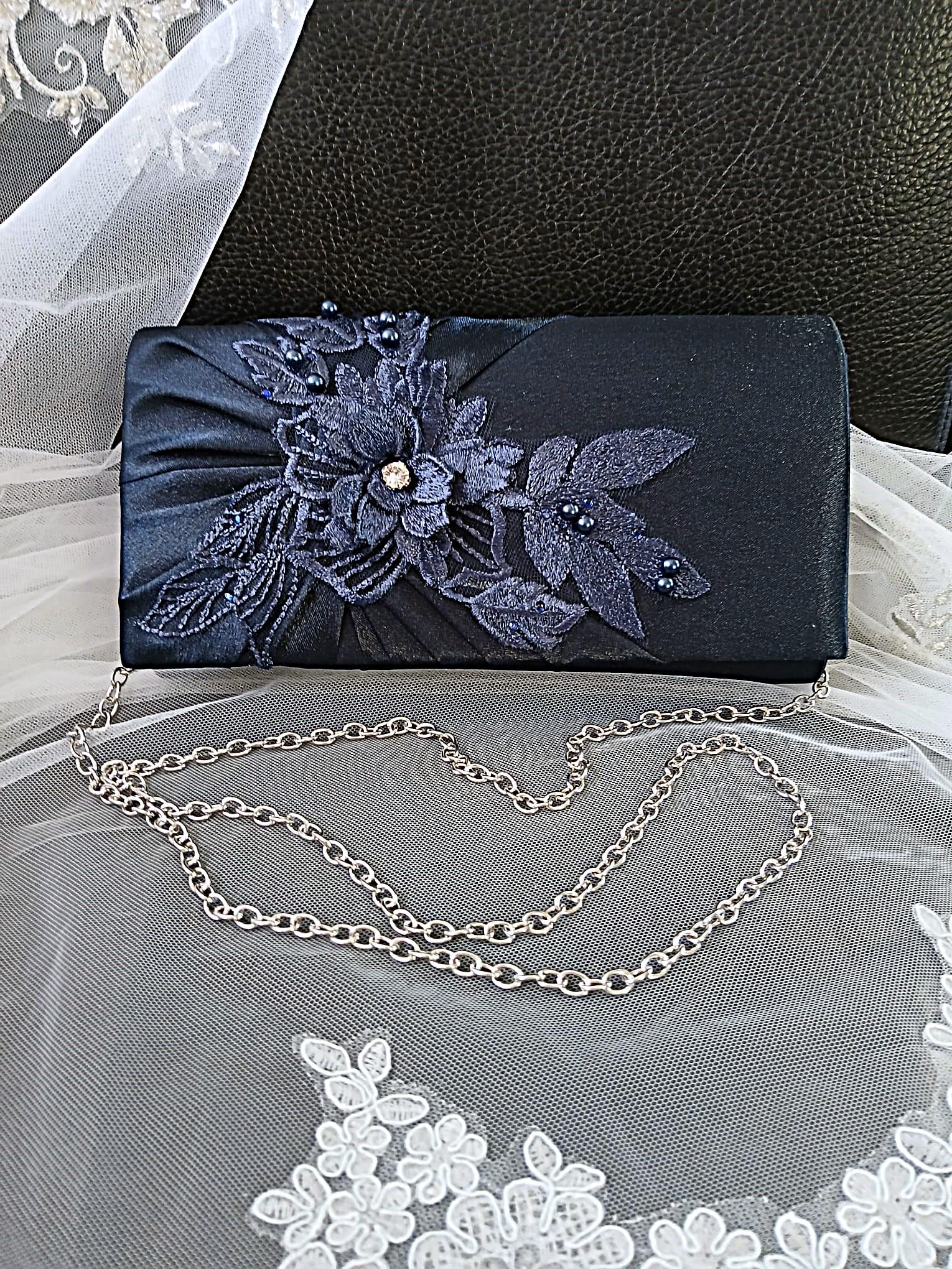 Navy Blue Floral Embellished Clutch Bag