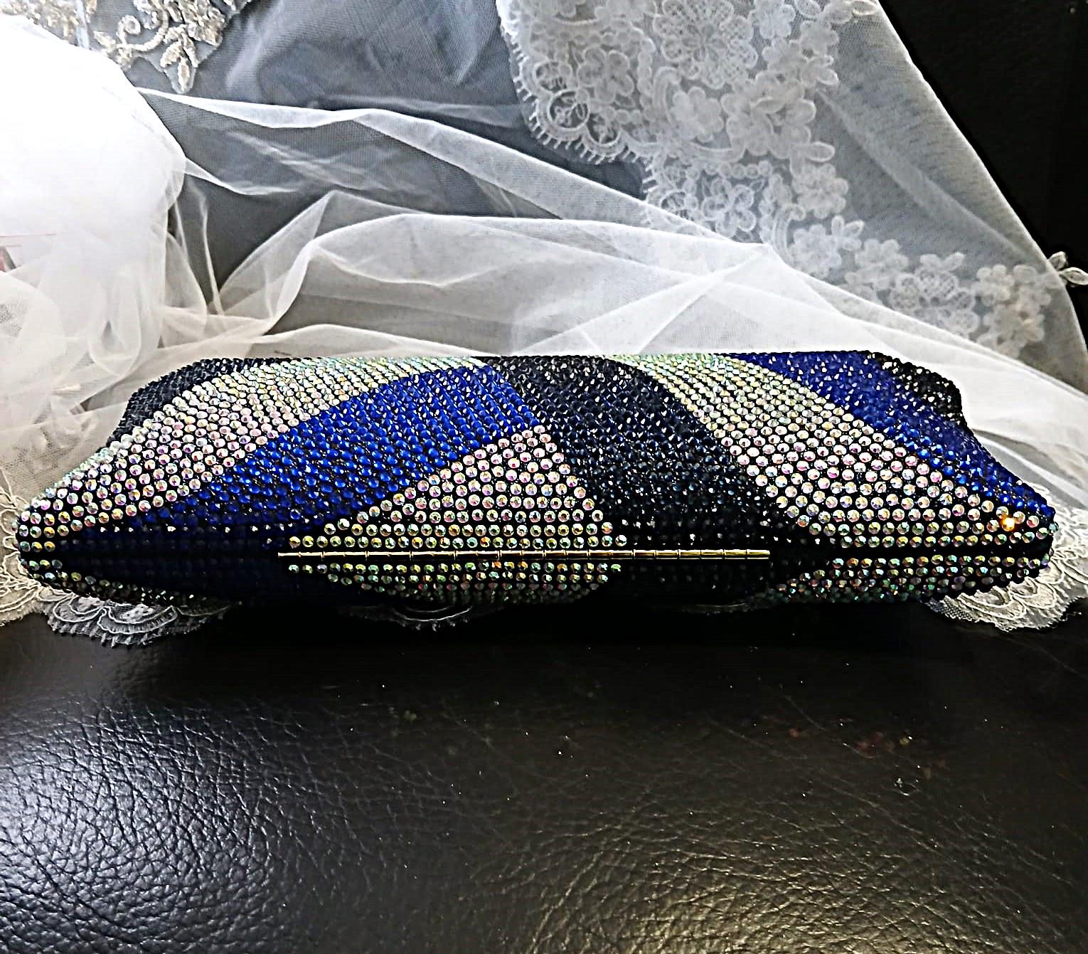 CompareThis evening clutch features a striking wave-inspired design covered in blue crystals, black accents, and shimmering AB crystal details for a bold and glamorous look. The slim structured silhouette gives it a refined finish, while the gold-tone chain strap adds elegance and versatility. Designed to stand out at special events, this clutch pairs beautifully with evening dresses, heels, and occasionwear for weddings, banquets, parties, and cocktail events.