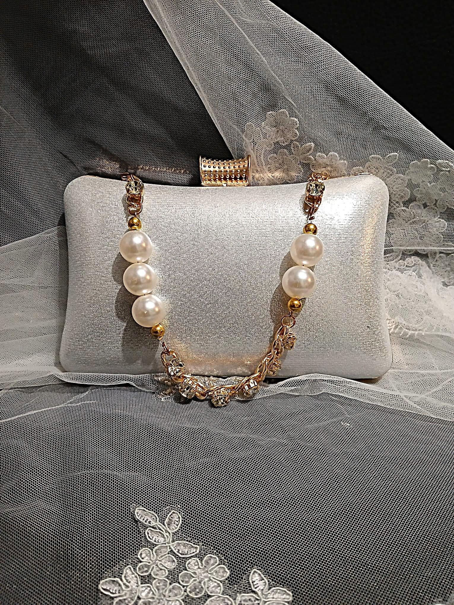 This ivory clutch bag is richly adorned with layered pearl beading, creating a luxurious and elegant look for special occasions. The structured silhouette is enhanced by gold-tone hardware, oversized pearl accents, and sparkling embellishments that bring a refined statement finish. With its decorative top clasp and versatile carry options, this bag is a beautiful choice for weddings, banquets, parties, and evening events.