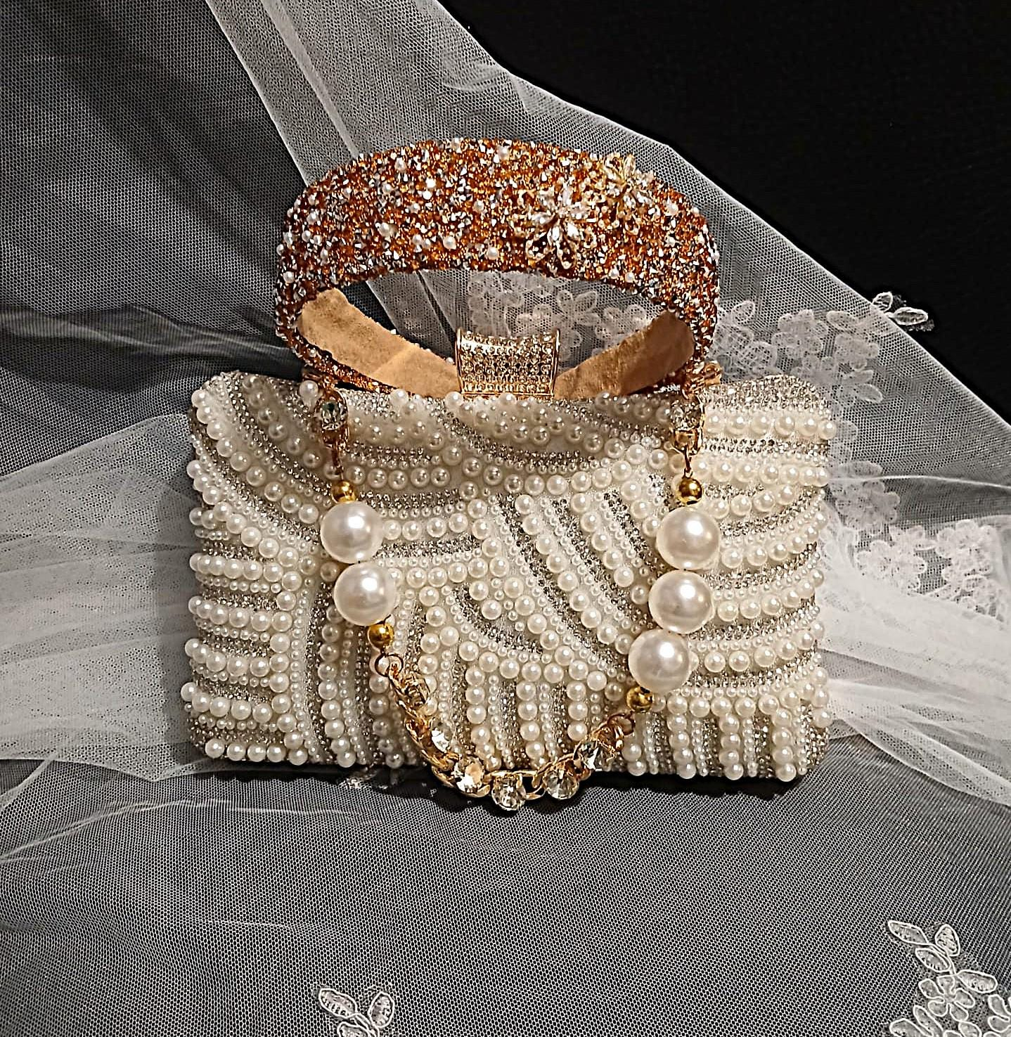 Designed with a fully embellished pearl-beaded exterior and a structured body for a polished and luxurious appearance.