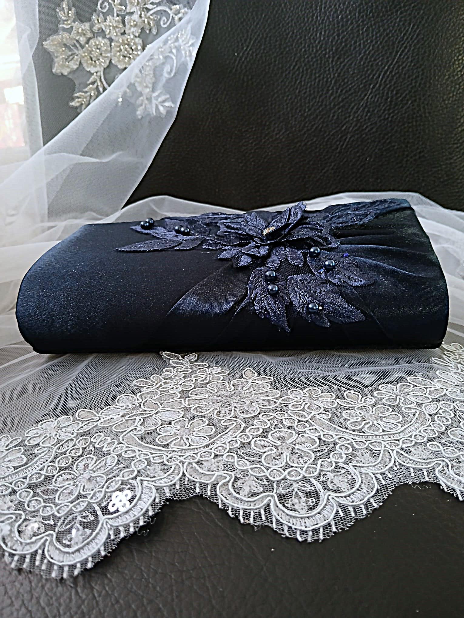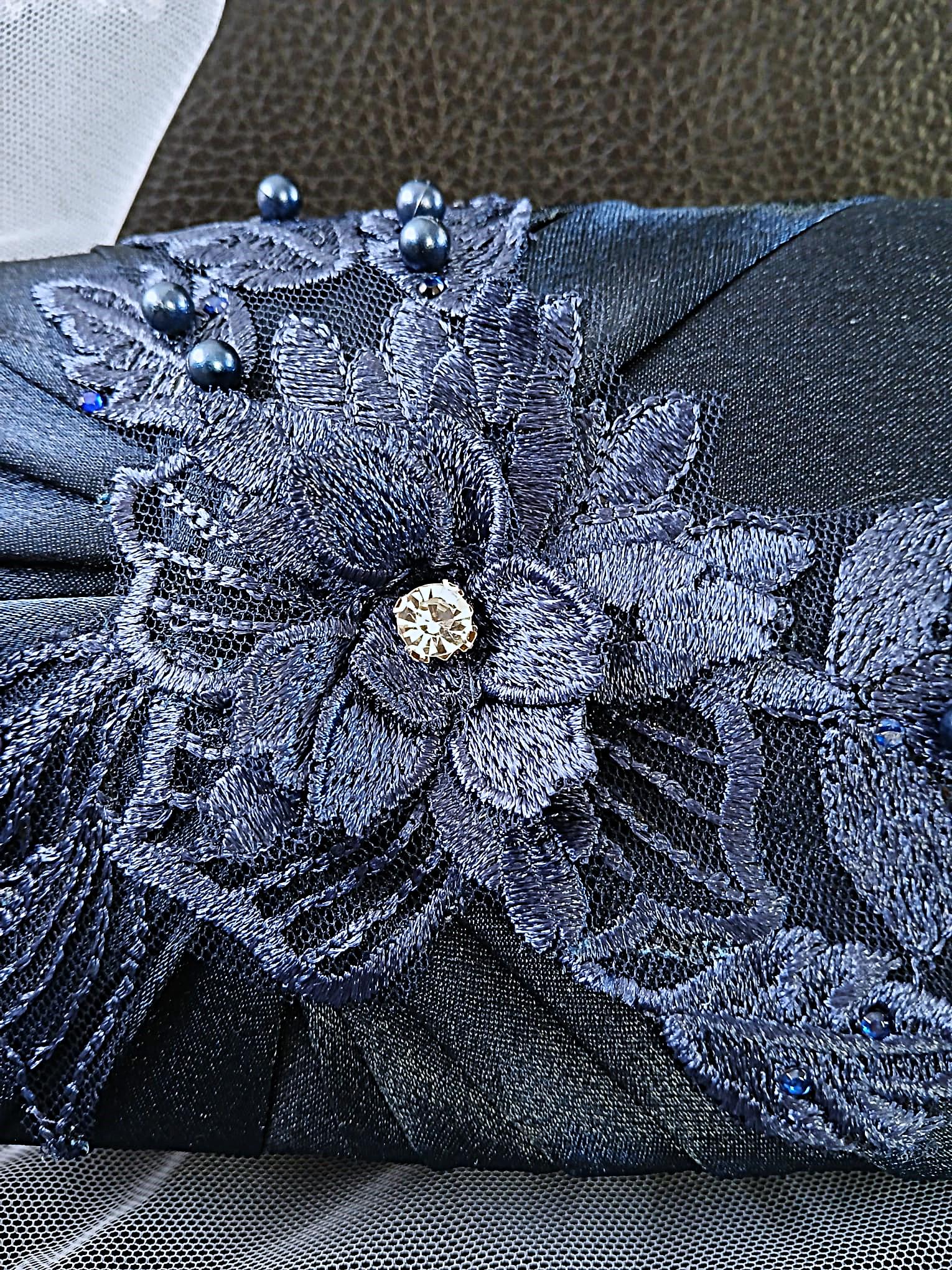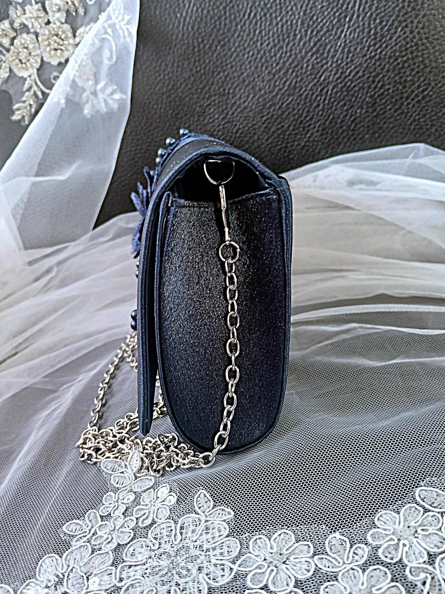 CompareThis navy blue clutch bag features a sleek structured silhouette accented with elegant floral appliqué for a refined and feminine look. The softly ruched detailing on one side adds texture and dimension, while the embroidered flower design brings a graceful statement touch. Designed for special occasions, this clutch pairs beautifully with dresses, heels, and formal outfits, making it a perfect choice for weddings, banquets, parties, and evening events.