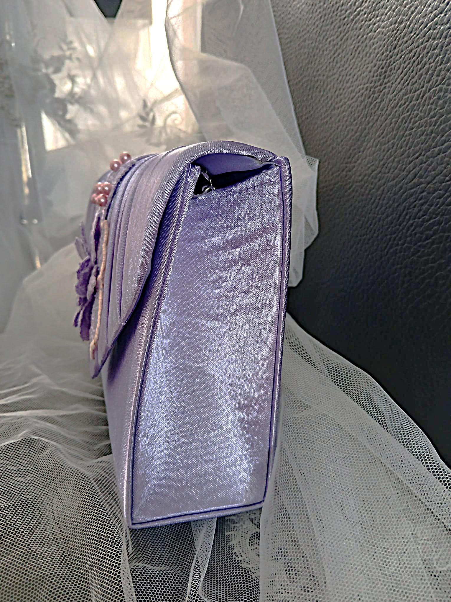 The front features a pleated envelope flap decorated with embroidered floral appliqué, lace-inspired detailing, and delicate bead accents, creating a graceful focal point.